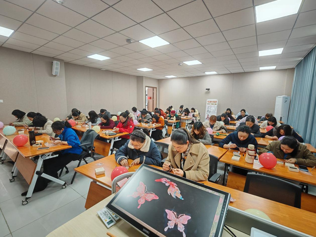 平日里,她们是三尺讲台上传道授业的师者,是办公室里恪尽职守的工作者,手握粉笔、敲击键盘,坚守教育初心;活动现场,她们化身专注的手艺人,沉浸式投入螺钿胸针的制作中。挑选色彩斑斓的螺钿片,用镊子精心布局,再细心点缀胶水固定。大家或低头细作,或互相交流配色心得,现场气氛热烈而温馨。经过一番巧手打造,一枚枚素净的胸针底托被赋予了独特生机,有的如青花瓷般雅致温婉,有的似彩蝶翩跹灵动,在灯光下折射出虹彩般的温润光泽,每一件作品都承载着女教职工们对生活的热爱与美好期许。