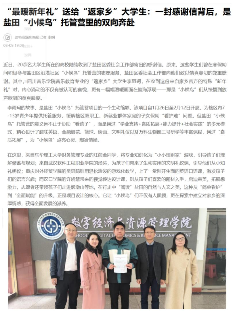 近日,深圳日报(读特)报道了我院2024级财务管理专业学生汪前金,在寒假“返家乡”社会实践活动中的突出表现。他与全国其他高校20余名大学生一起,用专业与热情为深圳市盐田区沿港社区的“小候鸟”们带来了一个充实温暖的寒假,其事迹获得盐田区委社会工作部的高度认可与书面感谢。现将原文转载如下: